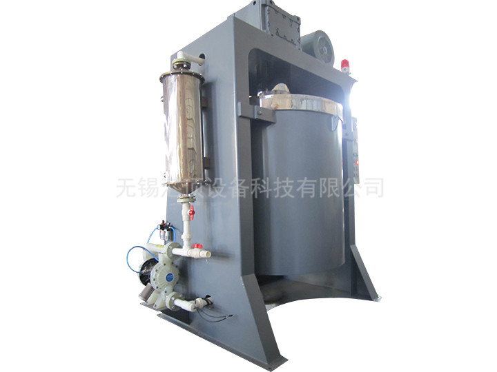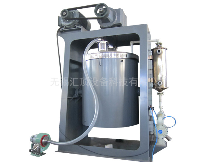 一種制造微粉的立式球磨機(jī),它是通過電機(jī)驅(qū)動(dòng)立式減速機(jī),通過聯(lián)軸節(jié),帶動(dòng)內(nèi)轉(zhuǎn)子研磨裝置旋轉(zhuǎn),使磨球、磨料、水混合液懸浮研磨。研磨過程中,水、磨料混合液通過循環(huán)系統(tǒng)連續(xù)循環(huán),直到達(dá)到標(biāo)準(zhǔn)。本裝置的特征在于:該內(nèi)轉(zhuǎn)子研磨裝置是由若干個(gè)沿?cái)嚢栎S螺旋上升的金屬攪棒垂直安裝的。